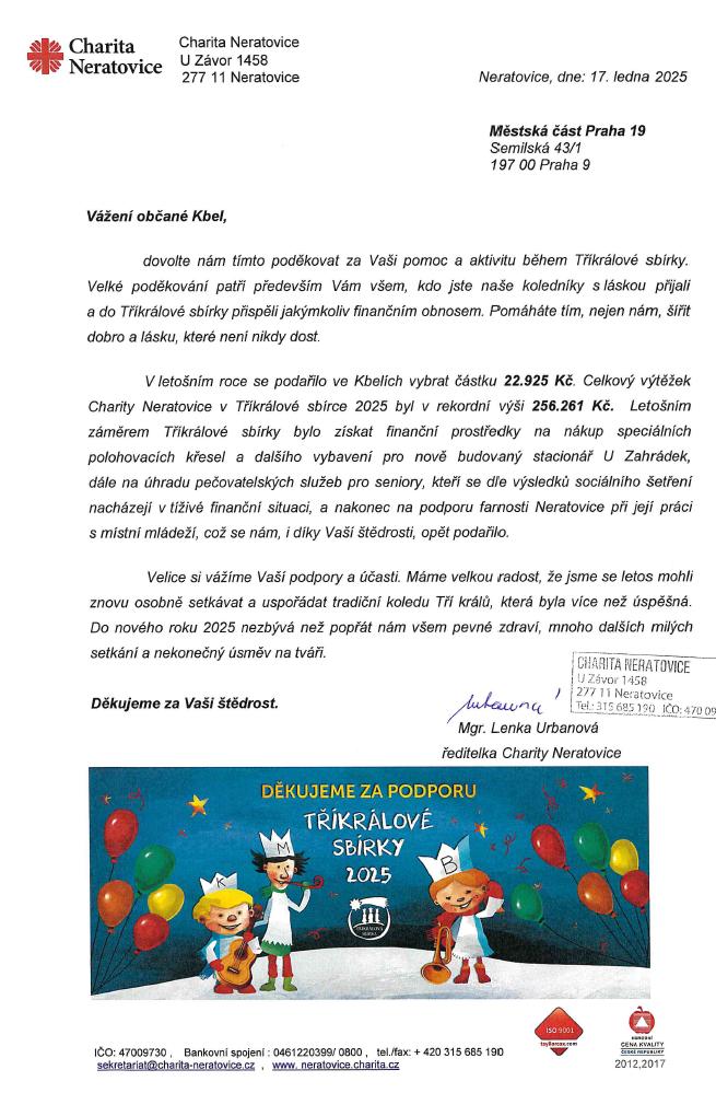 V letošním roce se podařilo ve Kbelích vybrat částku 22.925 Kč. Celkový výtěžek Charity Neratovice v Tříkrálové sbírce 2025 byl v rekordní výši 256.261 Kč. Letošním záměrem Tříkrálové sbírky bylo získat finanční prostředky na nákup speciálních polohovacích křesel a dalšího vybavení pro nově budovaný stacionář U Zahrádek, dále na úhradu pečovatelských služeb pro seniory, kteří se dle výsledků sociálního šetření
