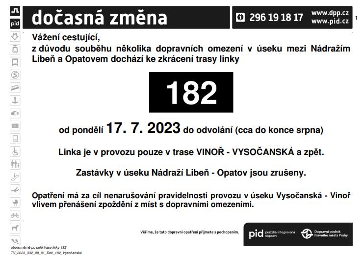 Kvůli problémům v provozu linky 182, které se dotýkají tři uzavírky na trase, rozhodl Dopravní podnik o jejím dočasném zkrácení na metro Vysočanská. Na trase je částečná uzavírka ulice Průmyslové, příští týden přibude částečná uzavírka ulice K Žižkovu a K Horkám.