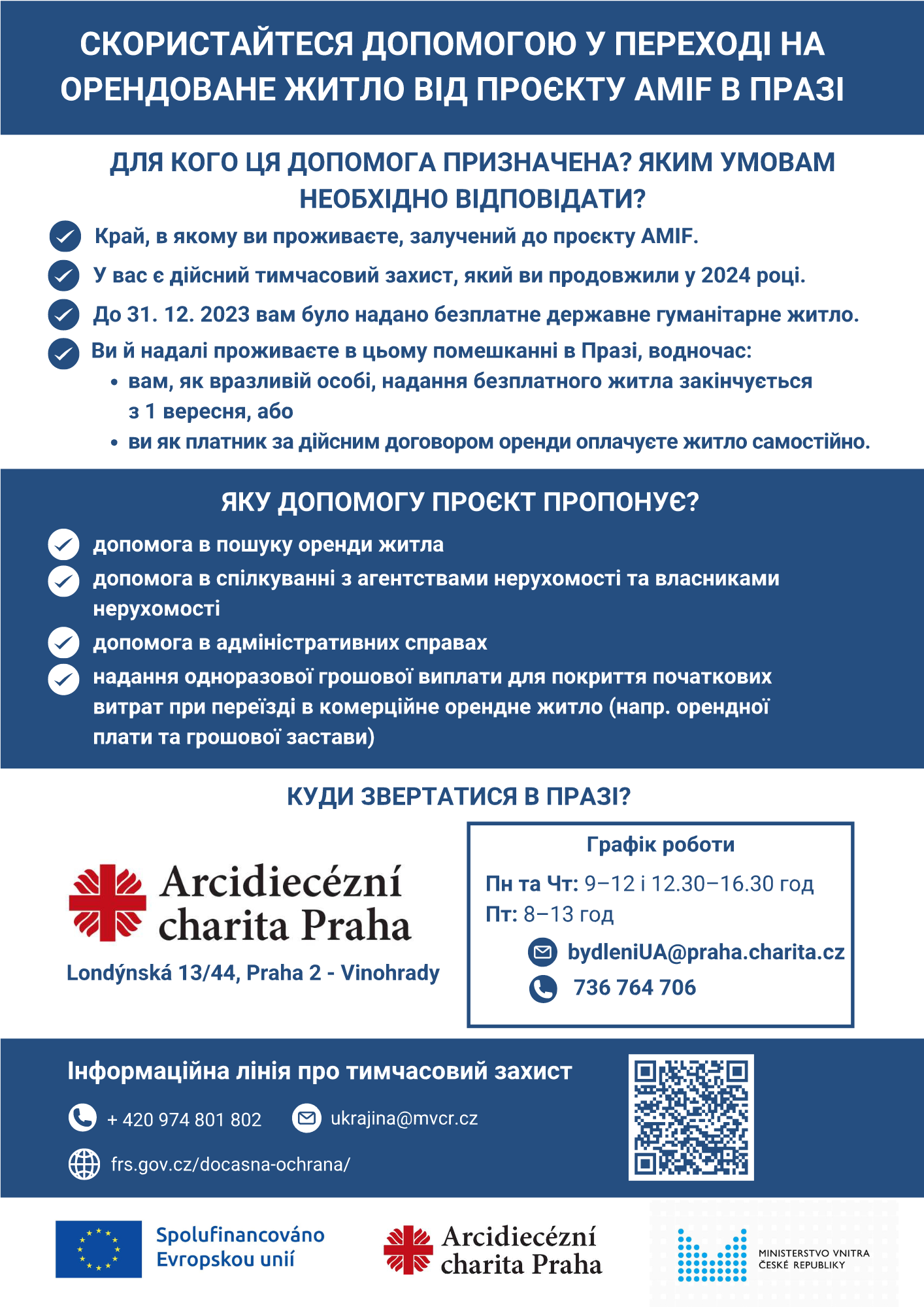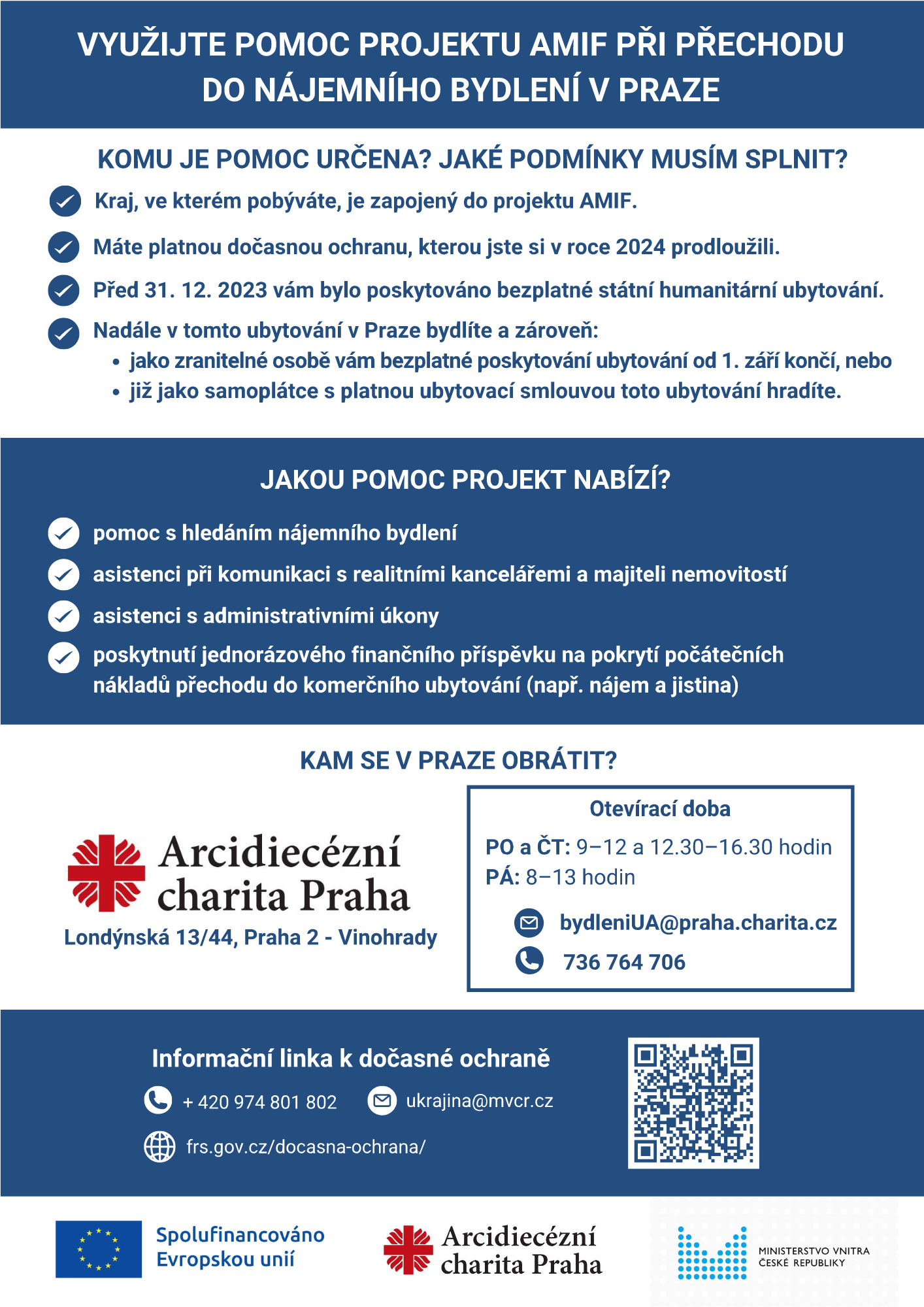 Zájemci o podporu z evropské dotace se mohou obrátit na Arcidiecézní charitu Praha. Osobní schůzku je možné sjednat na e-mailové adrese bydleniUA@praha.charita.cz nebo na telefonním čísle 736 764 706.