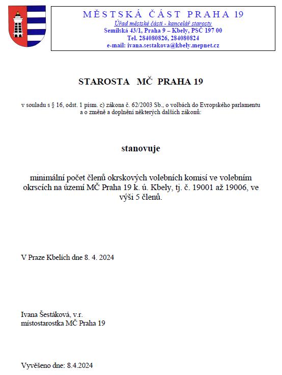 minimální počet členů okrskových volebních komisí ve volebním okrscích na území MČ Praha 19 k. ú. Kbely, tj. č. 19001 až 19006, ve výši 5 členů.