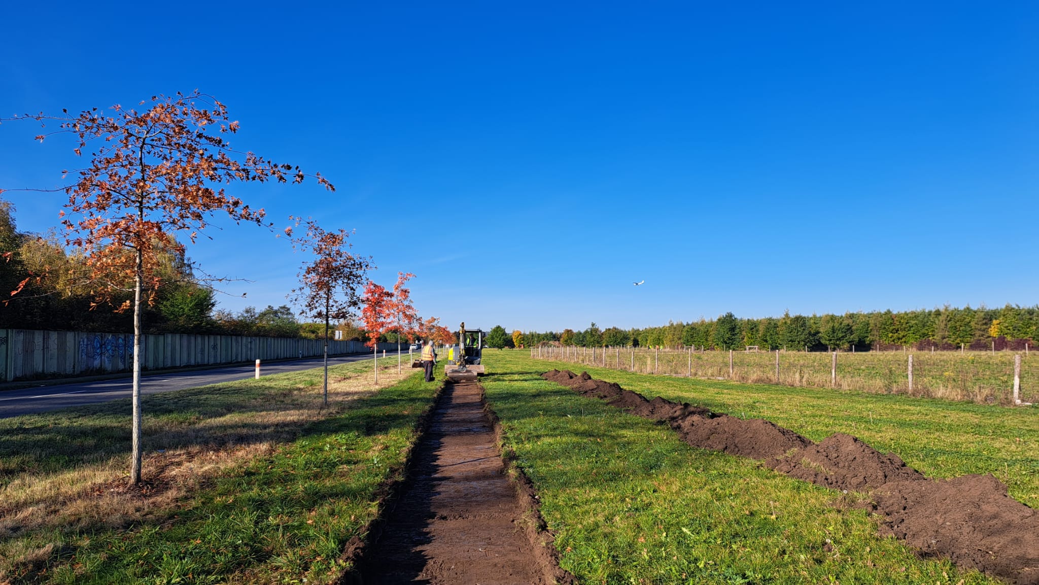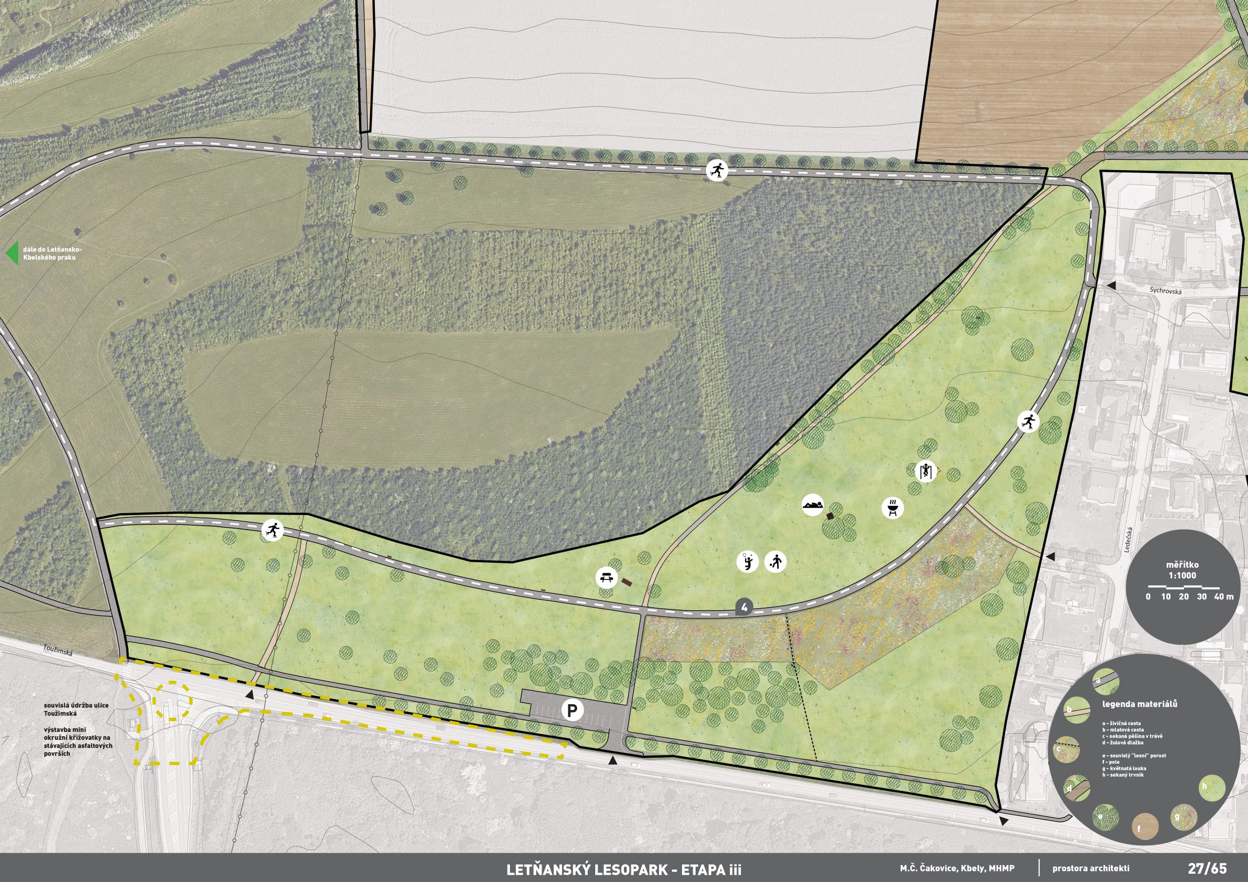 Druhá etapa se rozjíždí naplno až teď. Na jaře byla zahájena výsadba stromů v části úplně na jihu mezi Toužimskou a Ledečskou ulicí. Ode dneška se staví i cesty. Vznikne další bruslařský okruh, chodník na severní straně Toužimské, vedlejší mlatové stezky a malé parkoviště. Jestli počasí dovolí, cesty budou hotové na konci roku a na jaře budou dokončeny úpravy zeleně.